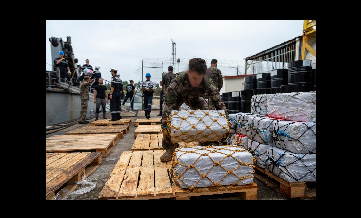 La saisie a été réalisée le 6 octobre par un bâtiment de la Marine nationale lors d’un contrôle d’un navire sans pavillon. Les militaires ont découvert « plus de sept tonnes de produits stupéfiants » répartis en 250 ballots, soit 7 056 kg de cocaïne, dissimulés dans une soute. Le navire a été ramené au port de Fort-de-France en Martinique (photo ci-dessus).