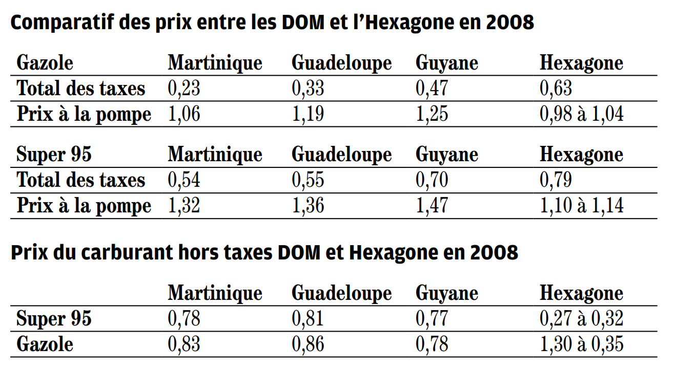 Lors du lundi politique de RCI du 2 décembre 2013, interrogé sur le décret Lurel Marie-Luce Pen chard expliquait que les pétroliers sont de toute façon plus forts, qu’ils ont les moyens d’imposer leur politique de prix et qu’en réalité elle avait au moins obtenu que les coûts du carburant ne soient pas plus élevés dans les DOM que dans l’Hexagone. C’est vrai, le niveau moyen des prix des carburants des DOM n’a pas été sur une longue période supérieure au niveau moyen constaté dans l’Hexagone. Sauf pour la Guyane. Mais ce qu’a oublié de dire Marie-Luce Penchard c’est qu’en réalité, cette égalité entre l’hexagone et les DOM est due à une fiscalité beaucoup plus élevée en France hexagonale sur les carburants. Ainsi les prix hors taxe du carburant en Guadeloupe étaient en 2008, au moment où la crise sociale de 2009 démarre au moins le double de ceux de l’Hexagone. (Voir tableaux).