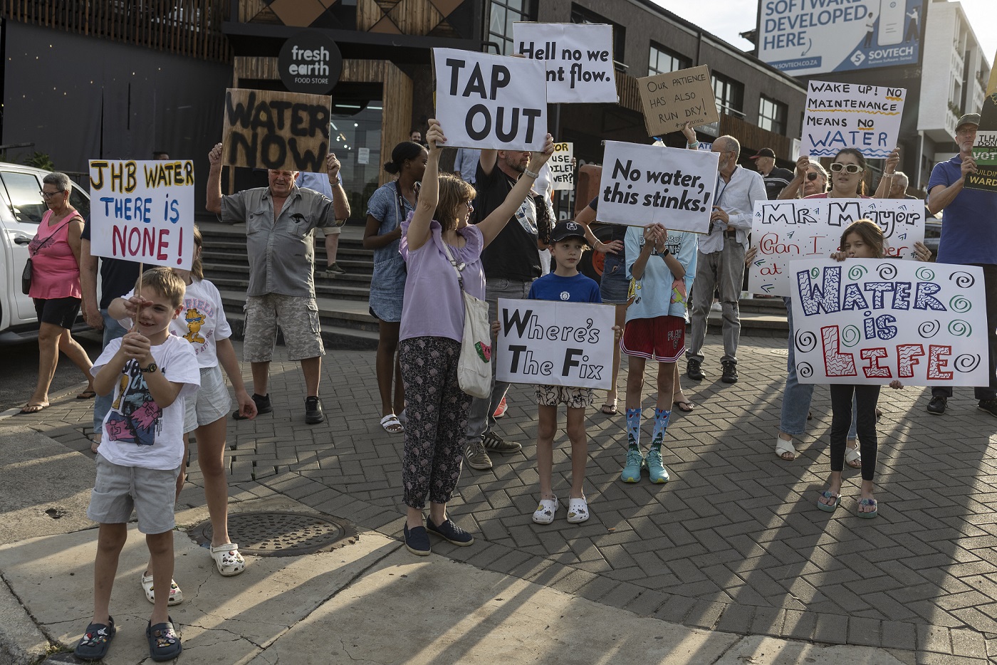 Des habitants brandissent des pancartes lors d’une manifestation contre l’absence d’accès à l’eau dans la région de Blairgowrie, à Johannesburg, le 12 mars 2024. Les habitants de Johannesburg se retrouvent sans eau en raison des infrastructures en ruine. Les habitants font la queue dans les zones où des camions-citernes d’eau de secours ont été déployés. Photo by WIKUS DE WET / AFP