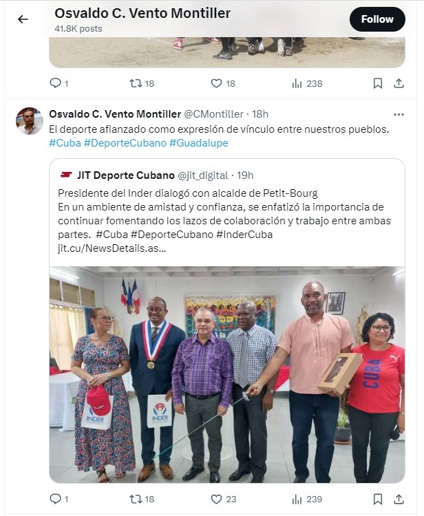 Le ministre cubain n’en a fait aucun écho sur ses réseaux sociaux. Il a préféré mettre en avant les dons offerts aux sportifs de son pays. Le Club d’escrime de la commune de Petit-Bourg a offert le 7 mars du matériel d’escrime de deuxième main en parfait état aux jeunes escrimeurs cubains (des appareillages lumineux pour les pistes d’escrime et 5 fleurets d’une valeur de 150 € pièces). « Le sport est renforcé en tant qu’expression du lien entre nos peuples » a commenté le ministre cubain sur son compte X (ancien Twitter).