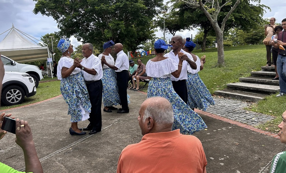 Malgré un ciel gris, de courtes averses, une affluence limitée, la bonne humeur est au rendez-vous aujourd’hui au bourg du Gosier, place du Calvaire. Jusqu’à 15 h 30, les animations s’enchaînent entre cours de gym tonique, prestations du club de quadrille des aînés « Espoirs de Vivre » (photo ci-dessus) et déclaration poétique de Nelly Phéron.