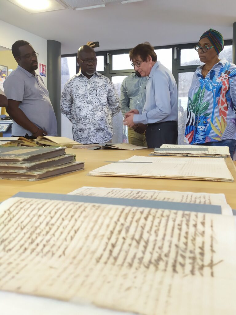 Bertin Calixte Biah, directeur du musée d’histoire de Ouidah au Bénin, lors de la visite des archives départementales de Guadeloupe le 29 mai 2024 à Bisdary, Gourbeyre. À sa gauche, Michel Mado, président de la commission culture du Département, ainsi que Brigitte Rodes (Basse-Terre). À sa droite Benoîte Jullien directeur des archives et Brigitte Rodes conseillère départementale. Photo : X Véronique Parmentier DR