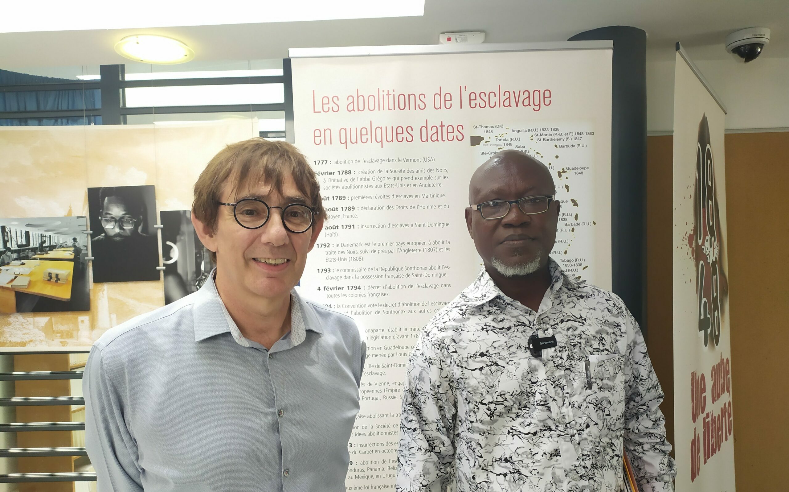 Le directeur des archives départementales de Guadeloupe, Benoît Jullien (à gauche, accueille le 29 mai 2024 Bertin Calixte Biah (à droite), directeur du musée d’histoire de Ouidah au Bénin, lors d'une visite des archives à Bisdary, Gourbeyre. Photo : X Véronique Parmentier DR