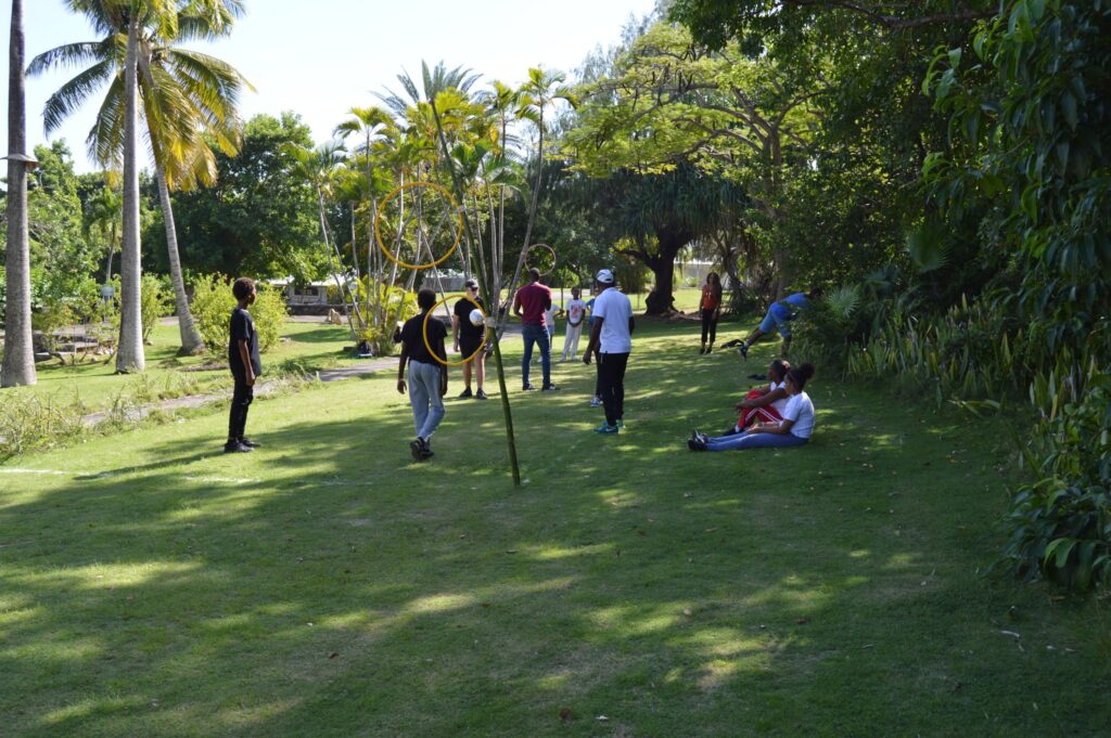 Les règles originelles, réservées à des athlètes, ont été adaptées. Dans les jardins du musée, à l’ombre des arbres géants et petits palmistes, deux équipes se renvoient la balle uniquement avec les coudes, les genoux ou les hanches, et tentent de la faire passer dans les anneaux en hauteur.