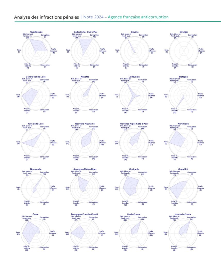 L’AFA a mis en page une visualisation sous forme de radar (graphique ci-dessous) qui met en évidence les typologies d’atteintes à la probité selon les territoires. En Guadeloupe, c’est l’incidence du détournement de fonds, de biens et de services publics qui est la plus forte. Elle est suivie par la corruption et le trafic d’influence qui occupent ex aequo les 2e et 3e rangs des infractions les plus poursuivies sur le territoire.