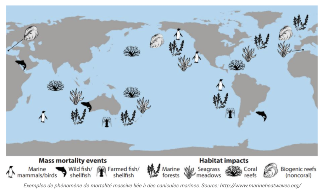 Le terme de canicule marine est employé si, pendant plus de cinq jours, la température de surface en mer est plus élevée que la moyenne. Les poches d’eau surchauffées qui stagnent sur un écosystème peuvent entraîner la mort de nombreuses espèces marines, surtout celles qui ne peuvent s’échapper. Par ailleurs, lorsque l’eau se réchauffe, la quantité d’oxygène dissous diminue jusqu’à engendrer des mortalités massives de poissons.