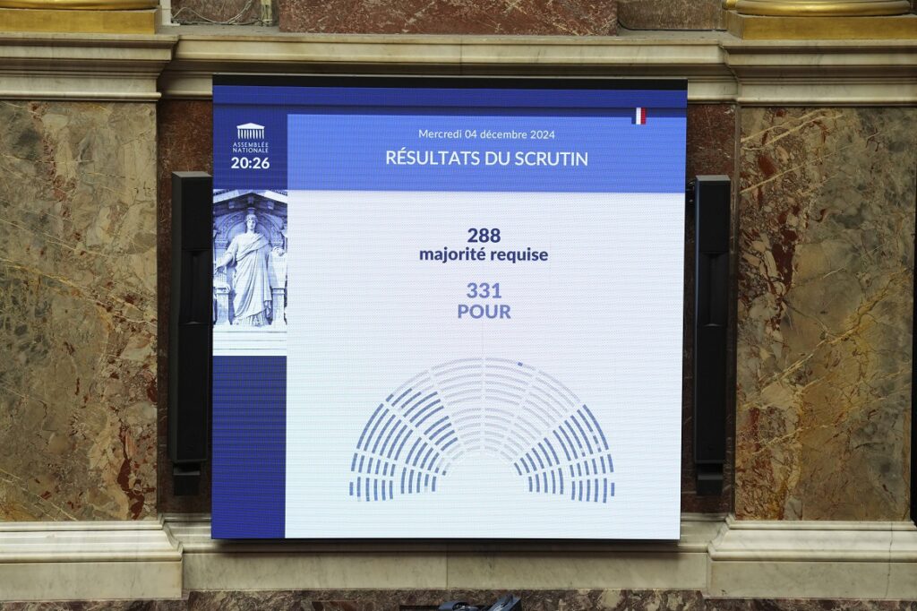 Le tableau d’affichage à l’Assemblée nationale montre les résultats du vote de censure provoqué par le refus du projet de loi de finance de la sécurité sociale 2025 qui contraint le Premier ministre Michel Barnier à démissionner, mercredi 4 décembre 2024 à Paris. Photo : Michel Euler / AP / Sipa