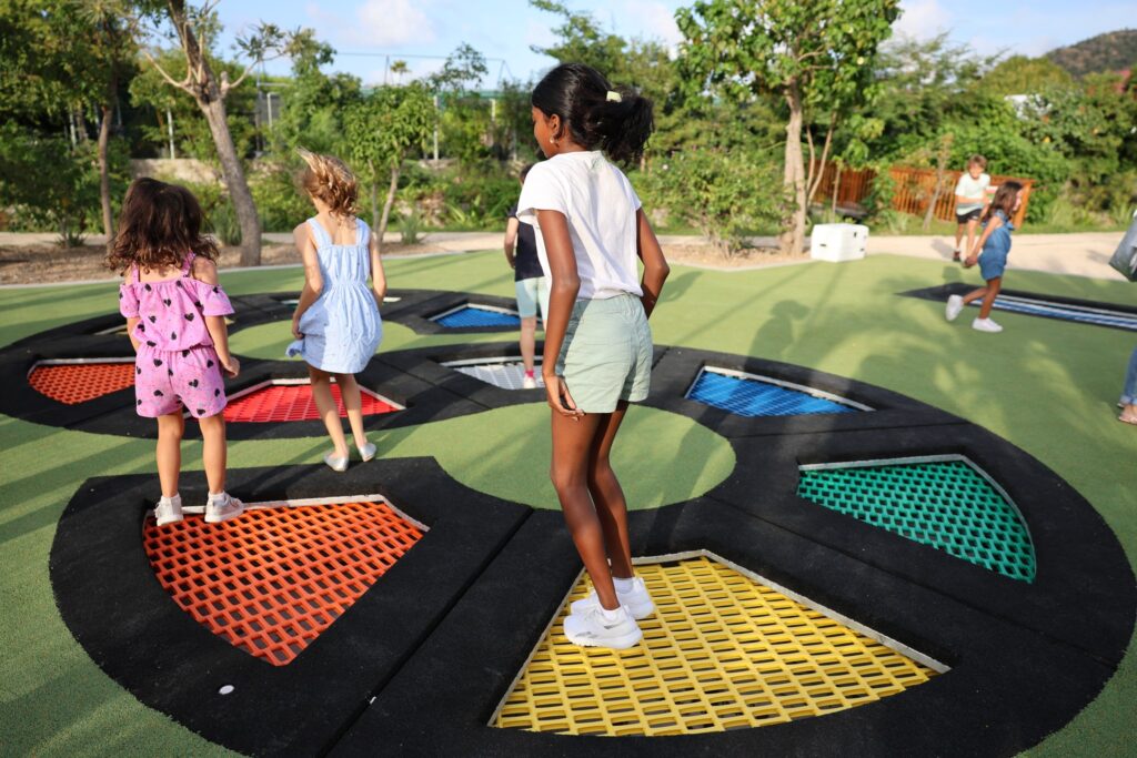 Au cœur de cette inauguration, des trampolines intégrés au sol captent l’attention avec un modèle spécialement conçu pour les personnes à mobilité réduite. Xavier Lédée, président du Conseil territorial, Marie-Hélène Bernier, première vice-présidente, et des membres du Conseil territorial des jeunes sont présents et se plient à la traditionnelle découpe du ruban bleu, blanc, rouge, et au dévoilement d’une plaque à l’entrée du site.
