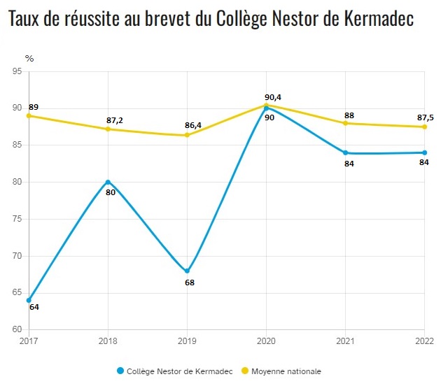 Quelques centaines de mètres plus loin, le collège de Kermadec, classé en Rep+, affiche un taux de réussite au diplôme national du brevet à 84% en 2022. Parti de 64% en 2017, le taux de réussite au DNB qui marque l’acquisition du socle commun de connaissance, compétence, culture, est en hausse avec 84% en 2022. Entre 2017 et 2022, le collège de Kermadec a rattrapé la moyenne nationale qui était en 2022 à 87,5% de réussite au DNB.