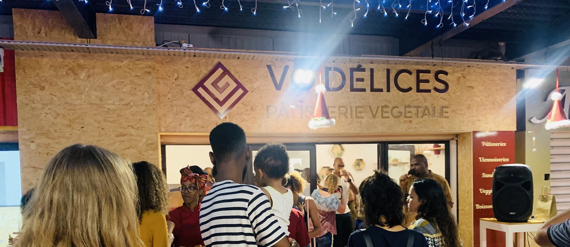 17 h 43, les galeries de Houelbourg, Jarry. Une cinquantaine de personnes se tient debout devant cette toute nouvelle pâtisserie. VG Délices, un nom peu commun, mais qui prend tout son sens lorsque l’on comprend sa signification. “VG” pour “végétale”, ou encore “vegan”. Ce mardi 17 décembre, VG délices, première pâtisserie végétale de la Guadeloupe, “des Antilles même”, comme le précise Laurence, la tête pensante derrière cette idée hors du commun, a été inaugurée au cours d’une soirée privée. Au programme, dégustation de viennoiseries 100 % végétales et tirage au sort pour tenter de gagner de nombreux lots offerts par les partenaires. Après quelques minutes qui semblent interminables, les convives sont invités à pénétrer dans la pâtisserie. Sans hésitation, tout ce petit monde se précipite à l’intérieur de la boutique. En passant la porte, on découvre un décor épuré. Le bois est à l’honneur. Un immense banc occupe le fond de la pièce principale. Juste au-dessus, des plantes trônent sur des petites étagères. Une petite table haute entourée de deux chaises est installée face à la vitrine réfrigérée où ont été installées plusieurs parts de bûches gourmandes, revisitées pour l’occasion, à l’approche des fêtes de fin d’année. Sur le mur qui jouxte la porte du “labo”, où le pâtissier et la cuisinière s’affairent à la préparation de mini-gourmandises pour les invités, il est inscrit la citation : “Let’s change the world, one piece of cake at a time” (Changeons le monde, une part de gâteau à la fois, NDLR). Une phrase qui prend tout son sens lorsque l’on connaît la motivation de la propriétaire, Laurence Ognibene. “C’est délicieux, je serais incapable de faire la différence avec des pâtisseries non vegan !” s’exclame une femme, tout en engouffrant un mini-croissant dans sa bouche.