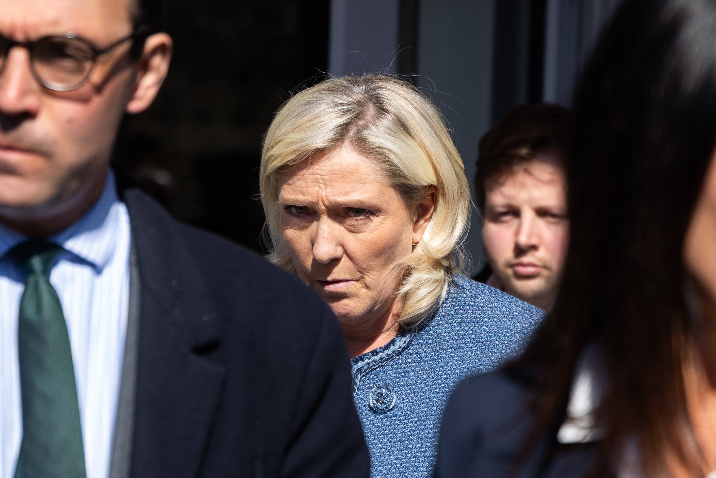 Marine Le Pen, présidente du groupe parlementaire d'extrême droite du Rassemblement national (RN), quitte le tribunal de Paris ce 31 mars après son procès pour suspicion de détournement de fonds publics européens. Le tribunal l’a reconnue coupable, et rendu un verdict qui l'empêche de se présenter aux élections et pourrait compromettre ses chances de se présenter à la prochaine élection présidentielle de 2027. Photo : Thomas Hubert / Sipa