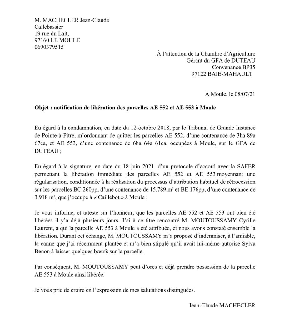 Au cours de cette réunion, il a été question de la parcelle AE 553, située à Blanchet, Le Moule. Cette parcelle, jusque-là occupée illégalement par la famille Machecler, aurait selon la Safer été libérée grâce à un protocole signé entre l’institution et Jean-Claude Machecler.