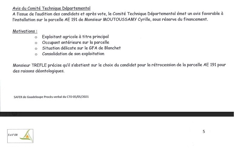 Patrick Sellin, président de la Chambre d’agriculture, conteste les démarches de la Safer. Dans une lettre adressée à Cyrille Moutoussamy le 9 février 2022, il rappelle qu’un avis favorable avait été émis dès le 5 mai 2021 pour l’installation de Monsieur Moutoussamy sur la parcelle AE 191.