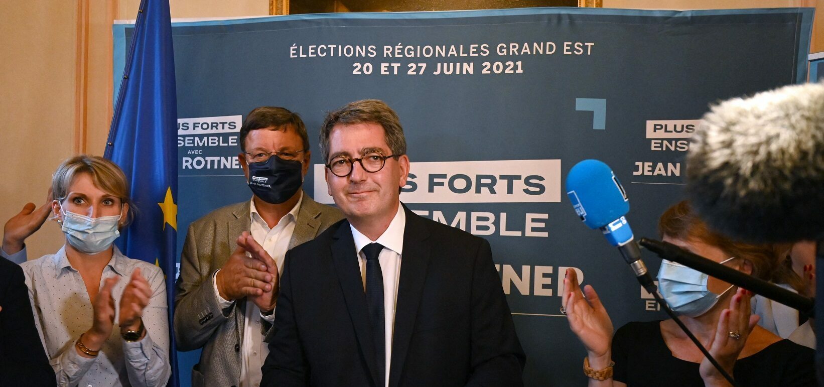 Candidat du parti de droite Les Républicains (LR) dans la région Grand Est, Jean Rottner prononce un discours après sa réélection au second tour des élections régionales françaises à Strasbourg, dans l'est de la France, le 27 juin 2021. / AFP / Frederick Florin