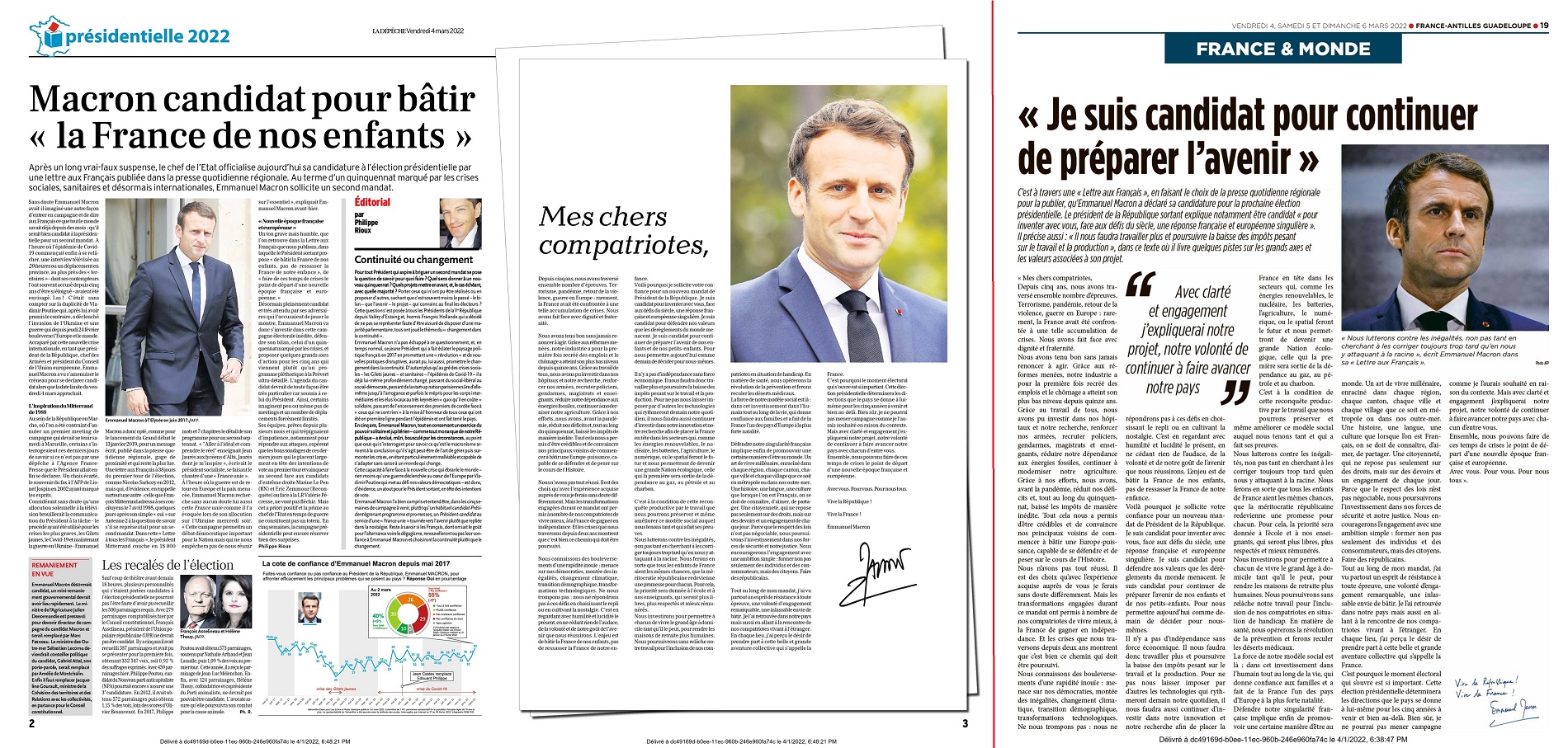 Emmanuel Macron a choisi d’annoncer sa candidature à l’élection présidentielle 2022 en envoyant le 3 mars sa lettre aux 63 quotidiens régionaux. Les quelques 158 hebdomadaires régionaux l’ont également reçu par ricochet. Des médias réputés toucher 20 millions de lecteurs chaque jour. Le quotidien France Antilles Guadeloupe n’a pas dérogé à l’élan qui a vu la quasi-totalité des journaux offrir sans filtre une pleine page à la missive macronnienne. Parmi ceux qui ont déjugé le processus, le quotidien La Voix du Nord basé à Lille qui a refusé de mettre en page l’intégralité du courrier pour n’en garder qu’une partie. Patrick Jankielewicz son rédacteur en chef s’en est expliqué dans la presse le 4 mars, exposant qu’” Emmanuel Macron candidat, n’est pas Emmanuel Macron président ” et qu’il convient de ne pas ” établir un déséquilibre entre les candidats “. Il est vrai que les concurrents politiques d’Emmanuel Macron l’accusent de faire campagne avec les moyens de l’État. Et cette opération les conforte. En obtenant gratuitement une campagne d’insertions de sa lettre mise en page selon un format non journalistique, le candidat-président enfreint-il la loi électorale au sujet du financement des partis politiques ? En acceptant de mettre en page et publier les affiches ainsi créées, les journaux ont-ils rendu des services et fourni des biens à titre gratuit au candidat-président ? Des biens tangibles et monnayables dont la valeur est exposée dans les kits média des titres : 861 000 € la page quadri en 2022 chez PQR66 qui commercialise l’espace publicitaire de 55 journaux. Extrapolée à l’ensemble des 63 quotidiens journaux payants, l’opération tutoie le million d’euros soit 6,1 % du plafond des 16,851 millions de dépenses autorisées au compte de campagne.