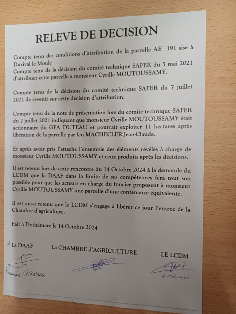À la suite de la réunion du 14 octobre, la Daaf s’engage dans un relevé de décisions à « dans la limite de ses compétences de faire tout son possible pour que les acteurs en charge du foncier proposent à Monsieur Cyrille Moutoussamy une parcelle équivalente à celle qui lui avait été attribuée au départ ». L’entrée de la Chambre d’agriculture est libérée par le LCDM dès le lendemain 15 octobre, comme le prévoyait le relevé de décisions.