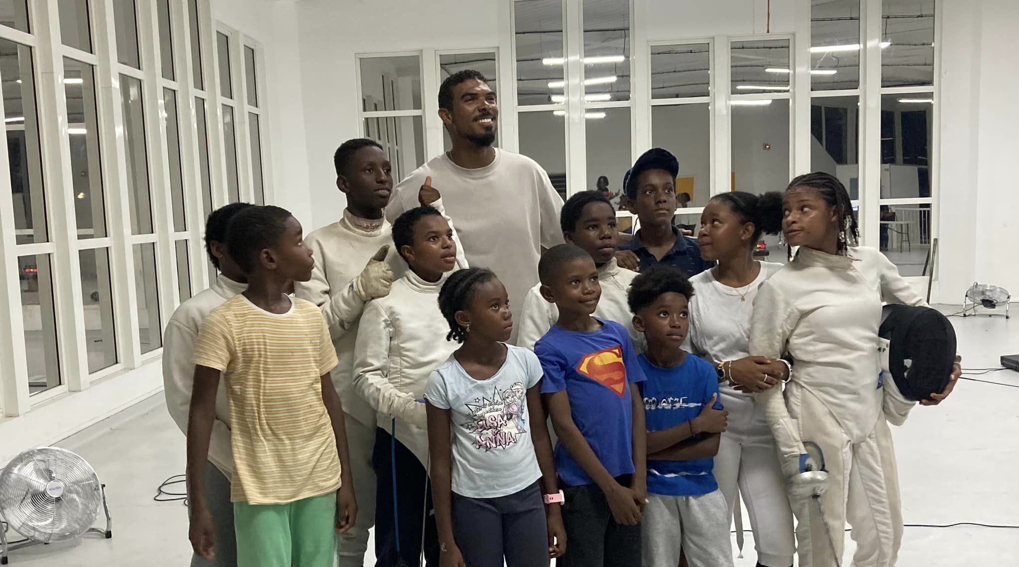Les petits pensionnaires du Cercle des escrimeurs de Pointe-à-Pitre se sont enthousiasmés de la visite surprise de Yanick Borel ce 8 avril. Photo : Cercle des escrimeurs de Pointe-à-Pitre